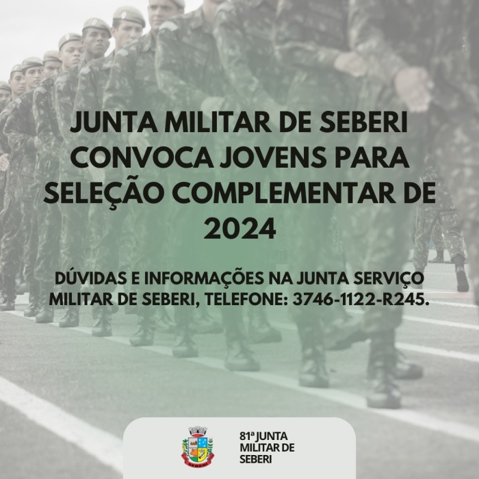 A Junta Militar de Seberi anunciou a convocação dos jovens inscritos no processo de Seleção Militar de 2024 para a Seleção Complementar, que será realizada no dia 7 de fevereiro de 2025.